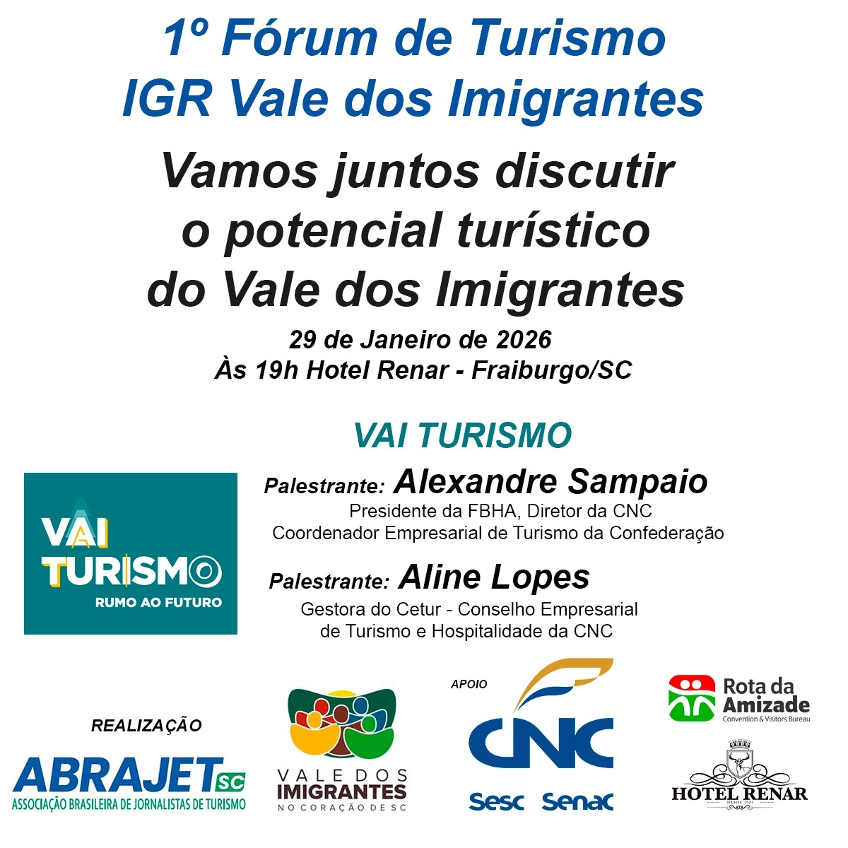 “Quando reunimos prefeitos, secretários de turismo, lideranças do setor e jornalistas especializados em um mesmo ambiente, criamos um espaço real de construção de posicionamento turístico. O Fórum nasce com esse propósito: provocar diálogo, apresentar o potencial da região e ampliar a visibilidade dos destinos que compõem o Vale dos Imigrantes. A ABRAJET-SC entende que o jornalismo de turismo tem papel estratégico na valorização dos territórios, e Fraiburgo, no contexto da colheita da maçã, traduz perfeitamente essa união entre identidade, economia e experiência turística”, afirma Maely Novak, presidente da ABRAJET-SC.